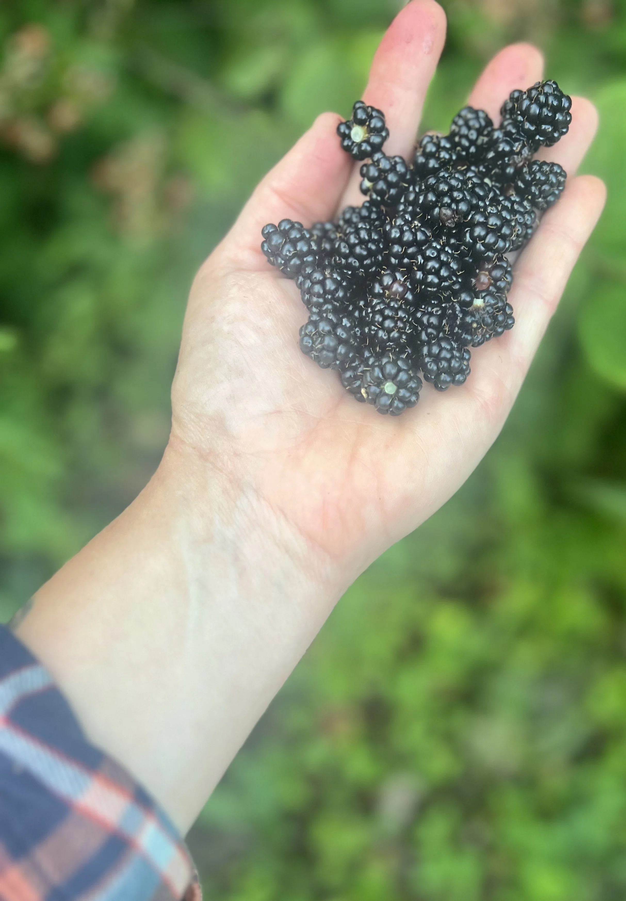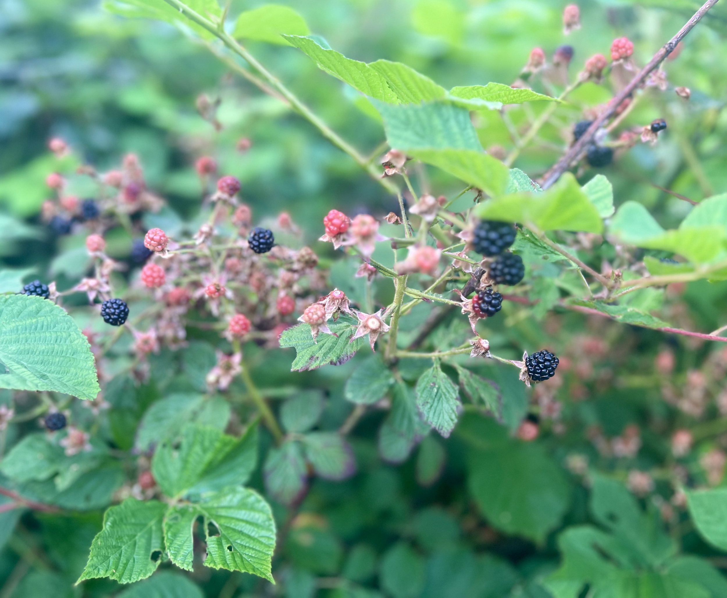 As dusk began to settle one evening and I had ventured far from the land surrounding our house, I came across a raspberry bush, scattered with blackberries.