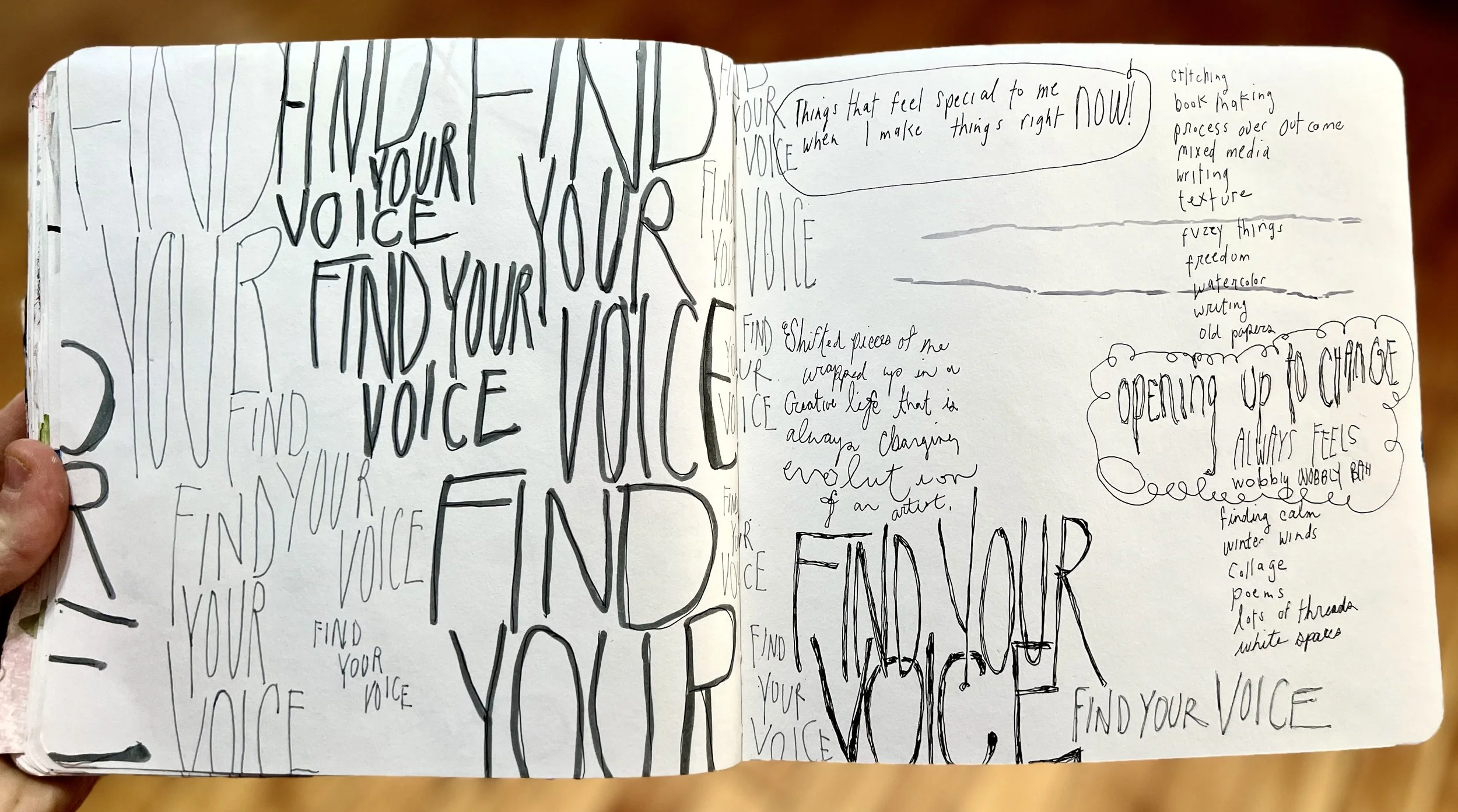Now it feels intentional and purposeful, now it feels like I own it. Finding my own voice today and everyday is a part of this. My voice is in the stillness of time and a day idling by because I decide to scrap my plans to write winter poems for a new book and instead doodle lists of Things that feel special in my art practice-NOW!