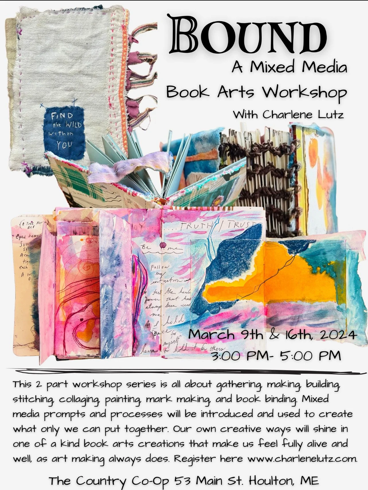 This two-part workshop series is all about gathering, making, collaging, painting, mark making and bookbinding binding. Mixed media processes and prompts will be introduced and used to create what only we can put together. Our own creative ways will shine in one of a kind book arts creations that make us feel fully alive and well, as art making always does.